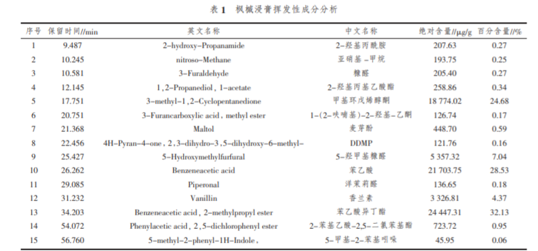 楓槭別名雞爪楓、槭樹,為槭樹科槭樹屬,主要 生長在美國和加拿大等美洲國家, 在中國長江流域 也有分布。 采用一定濃度的乙醇萃取楓槭樹皮等部 位,將溶劑去除獲得楓槭浸膏,楓槭浸膏為深褐色膏 體,具有強烈的焦糖香氣,可以用作食品添加劑以增 加烘烤、焦甜香。作為煙用香料,能夠提高煙香、矯正 卷煙吸味,增加卷煙自然清甜,改善卷煙余味,改善 干、澀、苦的口感 。 對楓槭浸膏揮發性成分有關報 道較少,蘇東贏將楓槭浸膏在不同溫度下進行熱 裂解,因為在裂解過程中會發生熱解、加成等復雜的 化學反應,沒 有對楓槭浸 膏揮 發 性 成 分 進 行 分析,不能表征楓槭浸膏的化學成分。通過對楓槭浸膏 揮發性成分進行鑒定, 旨在明確楓槭浸膏揮發性成 分種類及含量, 以期為楓槭浸膏合理使用提供數據支撐。