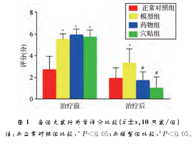 治療前,與正常對(duì)照組比較,模型組、藥物組和穴 貼組大鼠行為學(xué)評(píng)分明顯升高(P<0.05),提示造模 成功。治療后,與正常對(duì)照組比較,模型組大鼠行為 學(xué)評(píng)分明顯升高(P<0.05);與模型組比較,藥物組和 穴貼組大鼠行為學(xué)評(píng)分明顯下降(P<0.05);藥物組 與穴貼組之間差異無(wú)統(tǒng)計(jì)學(xué)意義(P>0.05)。見(jiàn)圖1。