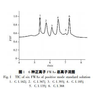 分別比較了 10 mmol /L 乙酸銨 - 乙腈、0. 1% 甲酸溶液 - 乙腈和水 - 乙腈 3 種流動(dòng)相體系梯度洗脫 對(duì) 10 種熒光增白劑響應(yīng)值和分離度的影響。結(jié)果顯示,以 0. 1% 甲酸溶液 - 乙腈梯度洗脫時(shí)的響應(yīng)值 較低,以水 - 乙腈梯度洗脫時(shí),10 種熒光增白劑的響應(yīng)值和分離度均不佳; 而采用 10 mmol /L 乙酸 銨 - 乙腈進(jìn)行梯度洗脫,10 種熒光增白劑的響應(yīng)值顯著增加,峰形和分離度均得到顯著改善,因此選 擇 10 mmol /L 乙酸銨 - 乙腈作為流動(dòng)相進(jìn)行梯度洗脫。