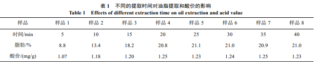 當樣品浸泡在正己烷溶劑中時, 溶解平衡使樣品中 的脂肪含量隨著時間的遞增呈現不同的濃度。因此研究不 同時間段溶劑對樣品脂肪的提取量和樣品脂肪酸價的影響, 對節省實驗時間具有重大意義。本次實驗分為 8 組, 每組 分別稱取 10 g 樣品于離心管中, 在管中分別加入過量的正 己烷(30 mL)進行震蕩溶解提取, 在 10~45 min 內每隔 5 min 測一次酸價和脂肪。最后對測定結果進行統計分析, 見表 1。 由表 1 可知, 隨著浸泡時間的增加, 溶劑中的脂肪含 量增加速率呈現不同變化, 經過分析可以將其變化速率分 為 3 個不同的階段。第 1 階段稱之為快速增長期, 在最初 提取的 15 min 內由于濃度梯度差很大, 樣品中的脂肪快速 溶解在正己烷溶劑中。第 2 階段為平緩增長期, 在提取的 15~25 min里, 樣品中的脂肪含量已經減少, 濃度梯度差變 小, 脂肪含量雖然也增加, 但增加的速度并沒有最初 1 階 段的速度快。第 3 階段為穩定期, 在 25~40 min 的時間段, 脂肪含量并沒有增加, 提取含量達到最大值, 提取效果達 到最大化。酸值的變化與脂肪含量的變化呈現平行增長, 因此提取時間達到 25 min 以上時, 酸值趨于穩定, 樣品中 不再有新油脂溶解出來, 脂肪的酸價一直保持穩定狀態。 因此樣品經過正己烷溶劑浸泡 25 min 后就可以提取完畢, 同比國標方法的常溫靜置浸提(12 h)縮短 96%的時間, 同 比國標方法的索氏提取法(4 h)縮短 89%的時間, 是一種 高效快速的提取方法。