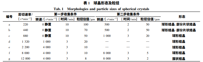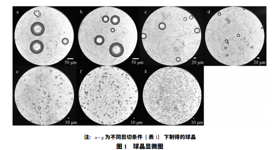 在不同剪切條件下制 備球晶,于顯微鏡下觀察所得產物粒徑及形狀,結 果見表 1、圖 1。由此可知,通過控制工藝條件可 制得粒徑 5 ~ 100 μm 之間的球晶,剪切速率較低 時,生成部分不規則形狀結晶; 剪切速率過高 ( >10 000 r/min) 時可得到初乳,但在固化過程 中乳 滴 破 裂,未能聚集成球晶,而 是 得 到 簇 狀 結晶。