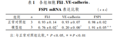 Fli1、VE-cadherin、FSP1 mRNA 表 達比較 TGF-β1 誘導 HUVEC 細胞后,QPCR 法檢 測 Fli1、VE-cadherin、FSP1 的表達,發現模型組內皮 標志物 VE-cadherin 表達降低( P < 0. 01) ,間質標志 FSP1 表達升高( P < 0. 01) ,提示 TGF-β1 誘導內皮 間質轉化模型建模成功; 同時模型組 Fli1 表達低于 對照組( P < 0. 05) 。見表 1。