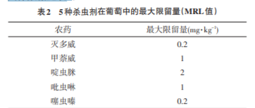 我國農產品中農藥殘留限量標準中對葡萄類漿果等小型水果中滅多威、啶蟲脒做出了殘留 限量規定而對于葡萄中的甲萘威、吡蟲啉和噻蟲嗪3種殺 蟲劑的殘留并沒有做出專門的規定,所以甲萘威、吡蟲啉 參考一些國家和國際衛生組織中對其在葡萄中的最大限 留量的規定,而噻蟲嗪在葡萄中的最大限留量在國內 外標準中均未規定,結合參考相關文獻中使用的標準。 具體數據見表2