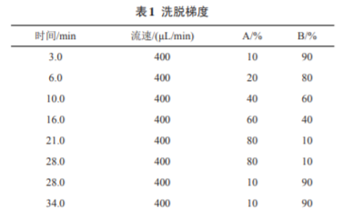 安捷倫Eclipse XDB-C18反相色譜柱 (4.6 mm×150 mm,3.5 µm),柱溫 40℃,流動相 A:B=乙 腈(: 水/0.1%甲酸),洗脫梯度見表1,進(jìn)樣體積10 µL。