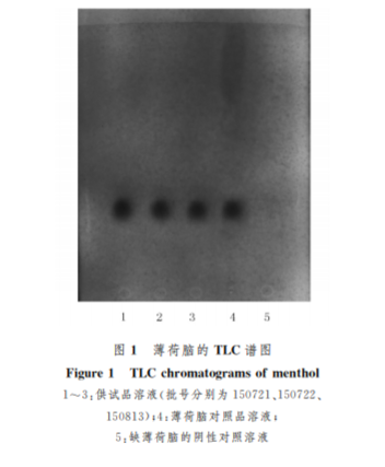 取復方薄荷酚酸酊(批號 150721、150722、150813)適量 作 為 供 試 品 溶 液。取 薄荷腦對照品加甲醇制成濃度為10mg/ml的對照 品溶液。按照制劑處方制備不含薄荷腦的復方薄荷 酚酸酊陰性 樣 品,取陰性樣品適量作為陰性對照。 按2015年版藥典四部 TLC 實驗 操 作 方 法,吸取 上述3種溶液各2μl,分別點于同一硅膠 G 薄層板 上,以甲苯-乙酸乙酯(V∶V=19∶1)為展開 劑,展 開,取出,晾干,噴以5%香草醛濃硫酸-乙醇(1∶4) 的混合溶液,在105 ℃加熱至斑點顯色清晰。在供 試品色譜中,與對照品色譜相應的位置上,顯相同顏 色的斑點,陰性對照色譜無相應斑點,見圖1。 2.2 乙醇含量測定 ?。保岔椣拢保皞€批次的復方 薄荷酚酸酊,各精密量?。玻担恚?,置150~200ml蒸 餾瓶中,加水約50ml。按照2015年版藥典四部通則 0711乙醇量測定法第二法蒸餾法,測定樣品中乙 醇的含量,每批次平行測定2份。結果顯示,樣品中 乙醇的含量為44%~50%,平均 值 為47%,擬定復方薄荷酚酸酊中乙醇的量在42%~52%。