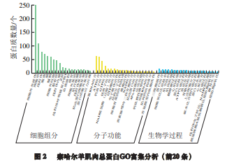 以UniProt/Swiss-Prot蛋白數(shù)據(jù)庫為背景,對(duì)總蛋白 進(jìn)行鑒定,初步建立察哈爾羊蛋白質(zhì)表達(dá)譜。由圖1可 知,1%假陽性條件下,背最長肌和臀肌中共檢測到蛋白 質(zhì)1 073 個(gè),其中背最長肌中共檢測到877 個(gè),臀肌中共 檢測到897 個(gè),2 個(gè)部位的總蛋白數(shù)量相近。對(duì)察哈爾羊肌肉總蛋白進(jìn)行GO組分富集分析,由 圖2可知:在細(xì)胞組分中,富集于細(xì)胞外外泌體中的蛋白 質(zhì)數(shù)量最多,其次富集于細(xì)胞質(zhì)內(nèi)的蛋白質(zhì)數(shù)量較多; 在分子功能中,蛋白質(zhì)主要參與聚RNA結(jié)合、ATP結(jié)合 和鈣離子結(jié)合等功能;在生物學(xué)過程中,蛋白質(zhì)主要參 與三羧酸循環(huán)、蛋白質(zhì)結(jié)合和細(xì)胞氧化還原穩(wěn)態(tài)等生物 學(xué)過程。